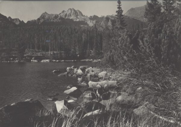 Widok na Wysok± znad Szczyrbskiego Jeziora. Na pierwszym planie brzeg jeziora z głazami w wodzie i kosodrzewin± (Pinus mugo Turra) na brzegu. W głębi las. W tle od lewej szczyty: Żabi Koń, Kopa Popradzka, Wysoka i Osterwa (z przodu po prawej stronie).
