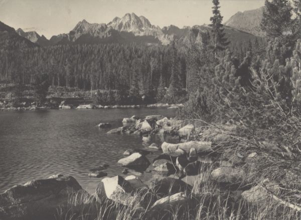 Widok na Wysok± znad Szczyrbskiego Jeziora. Na pierwszym planie brzeg jeziora z głazami w wodzie i kosodrzewin± (Pinus mugo Turra) na brzegu. W głębi las. W tle od lewej szczyty: Żabi Koń, Kopa Popradzka, Wysoka i Osterwa (z przodu po prawej stronie).