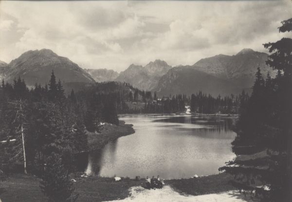 Widok na Szczyrbskie Jezioro z domu wypoczynkowego RZZ Baník. Na pierwszym planie siedzący na ławce wczasowicze. W tle Skrajna Baszta, Kopa Popradzka, Wołowy Grzbiet, Wysoka, Osterwa, Tępa i Kończysta.