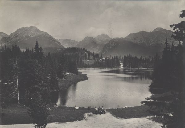Widok na Szczyrbskie Jezioro z domu wypoczynkowego RZZ Baník. Na pierwszym planie siedzący na ławce wczasowicze. W tle Skrajna Baszta, Kopa Popradzka, Wołowy Grzbiet, Wysoka, Osterwa i Tępa.
