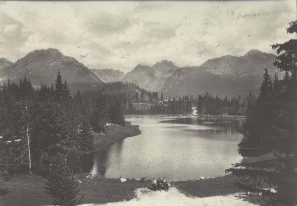 Widok na Szczyrbskie Jezioro z domu wypoczynkowego RZZ Baník. Na pierwszym planie siedzący na ławce wczasowicze. W tle Skrajna Baszta, Kopa Popradzka, Wołowy Grzbiet, Wysoka, Osterwa, Tępa i Kończysta.