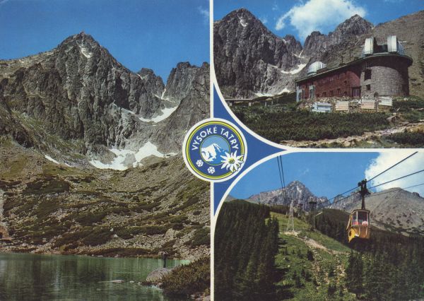 Pocztówka 3. elementowa. Na zdjęciu po lewej stronie widok znad Łomnickiego Stawu na Łomnicę. Obok u góry Obserwatorium Astronomiczne Słowackiej Akademii Nauk, w tle Łomnica. Poniżej wagonik kolei linowej gondolowej nad Łomnicki Staw, w tle Łomnica. Pomiędzy zdjęciami logo miasta VYSOKÉ TATRY.