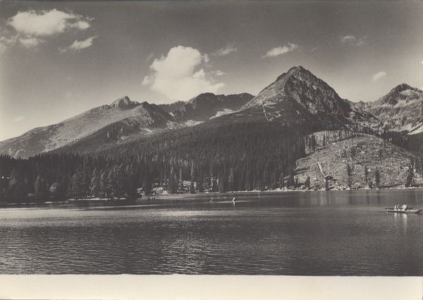 Widok na Szczyrbskie Jezioro i pływaj±ce po nim łódki. W tle od lewej strony szczyty: Krywań, Krótka, Ostra, Szczyrbskie Solisko i Szczyrbski Szczyt. Pod Skrajnym Soliskiem widoczna skocznia narciarska.