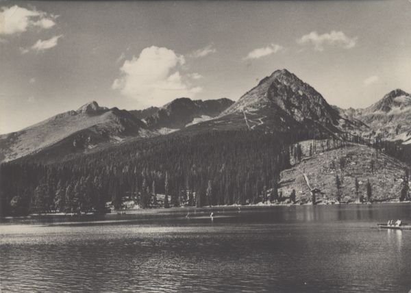 Widok na Szczyrbskie Jezioro i pływaj±ce po nim łódki. W tle od lewej strony szczyty: Krywań, Krótka, Ostra, Szczyrbskie Solisko i Szczyrbski Szczyt. Pod Skrajnym Soliskiem widoczna skocznia narciarska.