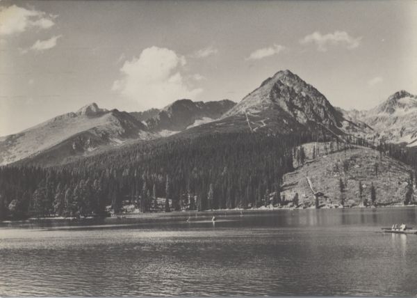 Widok na Szczyrbskie Jezioro i pływaj±ce po nim łódki. W tle od lewej strony szczyty: Krywań, Krótka, Ostra, Szczyrbskie Solisko i Szczyrbski Szczyt. Pod Skrajnym Soliskiem widoczna skocznia narciarska.