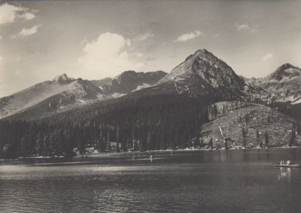 Widok na Szczyrbskie Jezioro i pływaj±ce po nim łódki. W tle od lewej strony szczyty: Krywań, Krótka, Ostra, Szczyrbskie Solisko i Szczyrbski Szczyt. Pod Skrajnym Soliskiem widoczna skocznia narciarska.