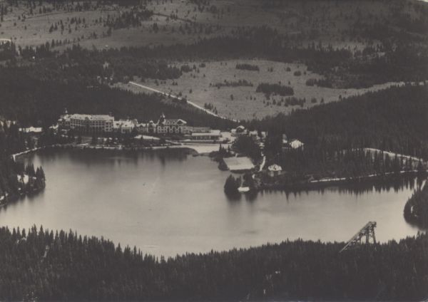 Widok na Szczyrbskie Jezioro. Na brzegu zabudowania sanatoryjno hotelowe. Po prawej stronie na dole widoczna skocznia narciarska.
