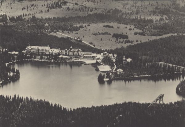 Widok na Szczyrbskie Jezioro. Na brzegu zabudowania sanatoryjno hotelowe. Po prawej stronie na dole widoczna skocznia narciarska.