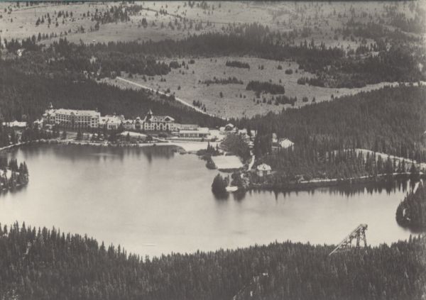 Widok na Szczyrbskie Jezioro. Na brzegu zabudowania sanatoryjno hotelowe. Po prawej stronie na dole widoczna skocznia narciarska.