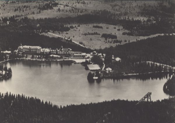 Widok na Szczyrbskie Jezioro. Na brzegu zabudowania sanatoryjno hotelowe. Po prawej stronie na dole widoczna skocznia narciarska.