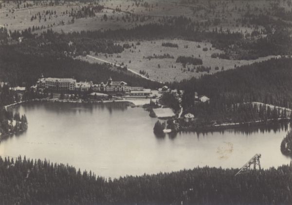 Widok na Szczyrbskie Jezioro. Na brzegu zabudowania sanatoryjno hotelowe. Po prawej stronie na dole widoczna skocznia narciarska.