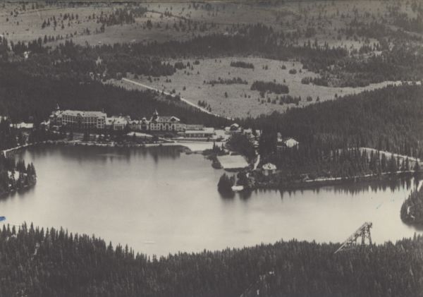 Widok na Szczyrbskie Jezioro. Na brzegu zabudowania sanatoryjno hotelowe. Po prawej stronie na dole widoczna skocznia narciarska.
