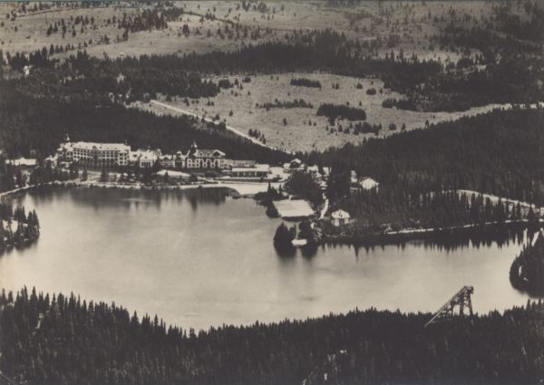 Widok na Szczyrbskie Jezioro. Na brzegu zabudowania sanatoryjno hotelowe. Po prawej stronie na dole widoczna skocznia narciarska.