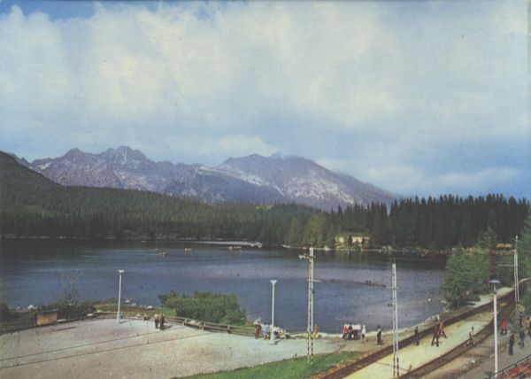 Widok na Szczyrbskie Jezioro. U dołu z lewej strony tory kolei elektrycznej i ludzie. W tle z lewej Kopa Popradzka i Wysoka, z prawej Tępa i Kończysta.