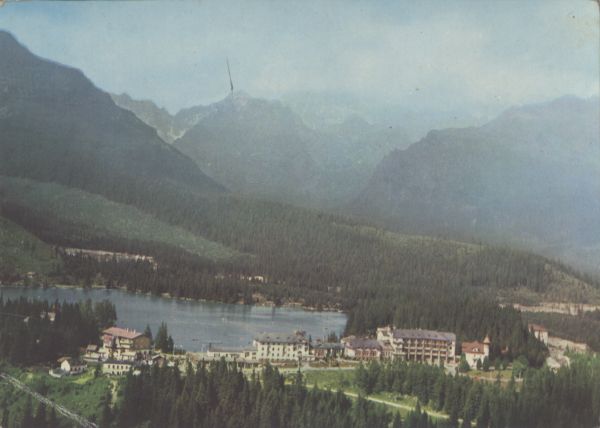 Widok na Szczyrbskie Jezioro i jego otoczenie. Widoczne zabudowania wypoczynkowo-sanatoryjne, las, w tle szczyty gór.