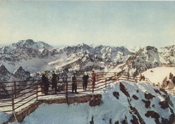 Na pierwszym planie tury¶ci na platformie widokowej na szczycie Łomnicy. W tle zimowy pejzaż. Widać od lewej: Gerlach, Wysok±, Krywań, Rysy. Po prawej stronie Lodowa Kopa.