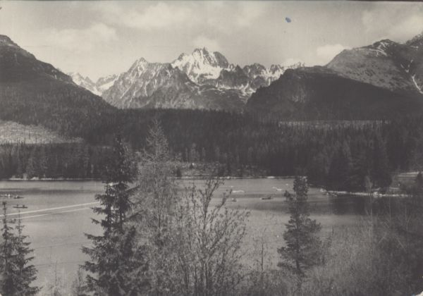 Widok na Wysok± znad Szczyrbskiego Jeziora. Na jeziorze widoczne łodzie.