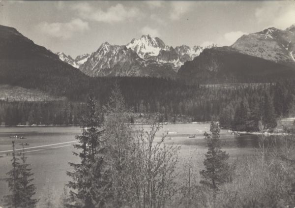 Widok na Wysoką znad Szczyrbskiego Jeziora. Na jeziorze widoczne łodzie.