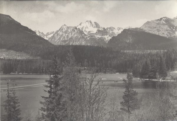 Widok na Wysok± znad Szczyrbskiego Jeziora. Na jeziorze widoczne łodzie.