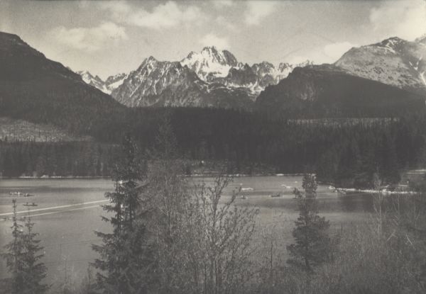 Widok na Wysok± znad Szczyrbskiego Jeziora. Na jeziorze widoczne łodzie.