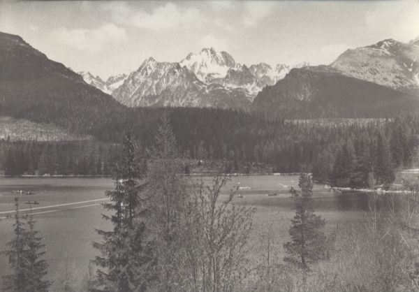 Widok na Wysok± znad Szczyrbskiego Jeziora. Na jeziorze widoczne łodzie.