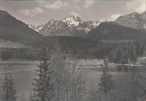 Widok na Wysok± znad Szczyrbskiego Jeziora. Na jeziorze widoczne łodzie.
