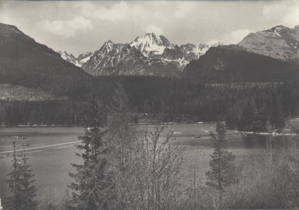 Widok na Wysok± znad Szczyrbskiego Jeziora. Na jeziorze widoczne łodzie.