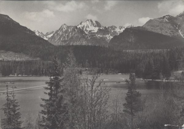 Widok na Wysok± znad Szczyrbskiego Jeziora. Na jeziorze widoczne łodzie.