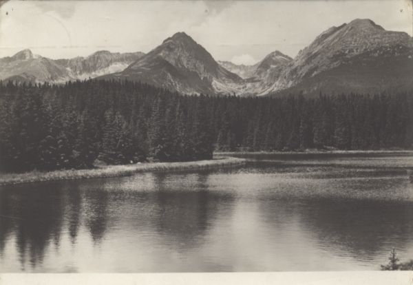 Widok Szczyrbskiego Jeziora z odbijaj±cymi się wodzie szczytami. W tle widoczne: Szczyrbskie Solisko, Krywań, Ostra, Szczyrbski Szczyt i Skrajna Baszta.