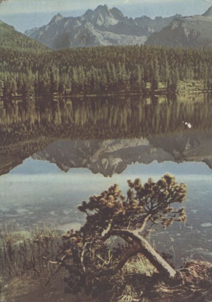 Widok na Szczyrbskie Jezioro. Otaczaj±cy go las i szczyty odbijaj± się w wodzie. W tle Wysoka. Na pierwszym planie kosodrzewina (Pinus mugo Turra) na brzegu jeziora.