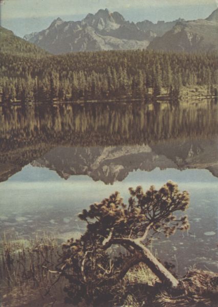 Widok na Szczyrbskie Jezioro. Otaczaj±cy go las i szczyty odbijaj± się w wodzie. W tle Wysoka. Na pierwszym planie kosodrzewina (Pinus mugo Turra) na brzegu jeziora.