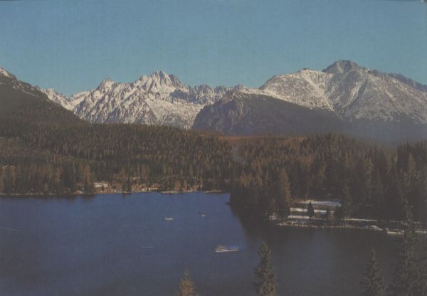 VYSOKÉ TATRY - HOHE TATRA - THE HIGH TATRAS Pohľad od Štrbského plesa (1346 m) na Kôpky (2354 m) vľavo, Vysokú (2560 m) a Končistú (2535 m)