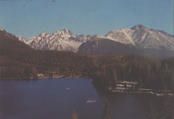 VYSOKÉ TATRY - HOHE TATRA - THE HIGH TATRAS Pohľad od Štrbského plesa (1346 m) na Kôpky (2354 m) vľavo, Vysokú (2560 m) a Končistú (2535 m)
