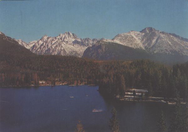 VYSOKÉ TATRY - HOHE TATRA - THE HIGH TATRAS Pohľad od Štrbského plesa (1346 m) na Kôpky (2354 m) vľavo, Vysokú (2560 m) a Končistú (2535 m)