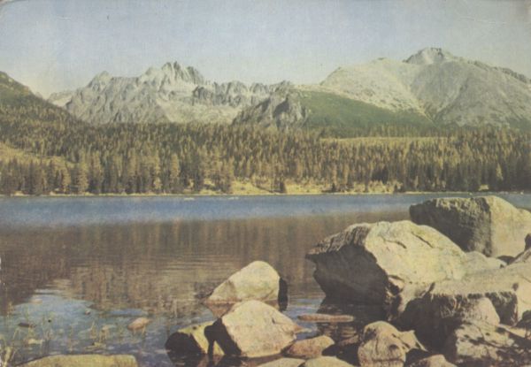 Widok znad Szczyrbskiego Jeziora na Wysok±. Na lewo Kopa Popradzka, na prawo Osterwa. Na pierwszym planie brzeg jeziora z głazami.