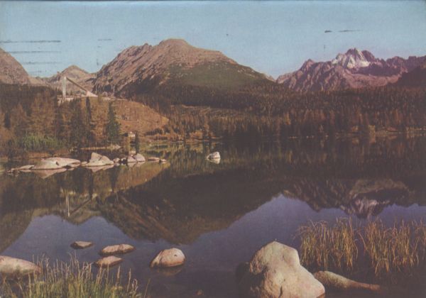 VYSOKÉ TATRY - HOHE TATRA - THE HIGH TATRAS ©trbské Pleso (1355 m). V pozadí lyľiarsky mostík, nad ním ©trbský ątít (2385 m), hrebeň Báąt s Patriou (2203 m) a Vysoká (2560 m)