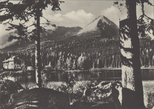 Widok na Szczyrbskie Jezioro. Z lewej strony wila Marina. W tle widoczne Wielkie Solisko.