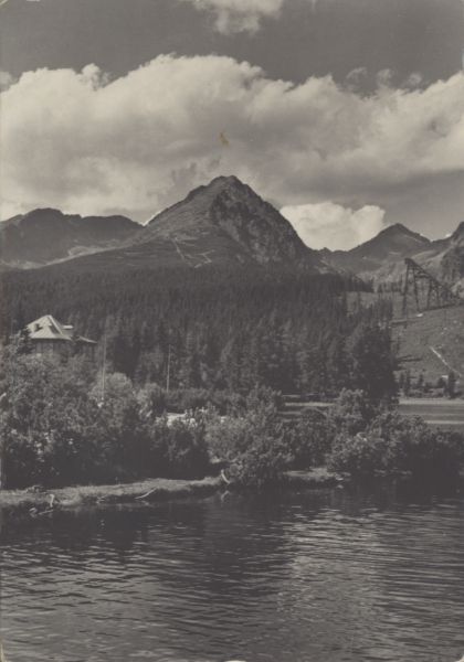 Widok na Szczyrbskie Jezioro. Za nim las, w tle Ostra, Wielkie Solisko i Szczyrbski Szczyt. Z prawej strony skocznia, z lewej willa Marina.