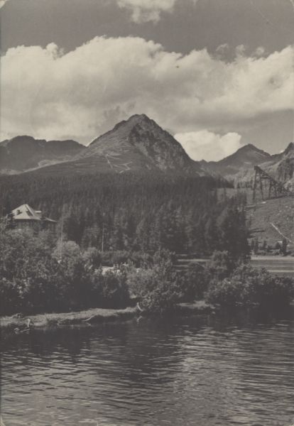 Widok na Szczyrbskie Jezioro. Za nim las, w tle Ostra, Wielkie Solisko i Szczyrbski Szczyt. Z prawej strony skocznia, z lewej willa Marina.