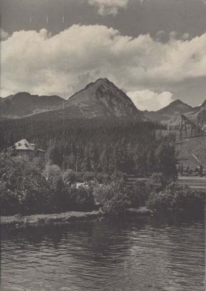 Widok na Szczyrbskie Jezioro. Za nim las, w tle Ostra, Wielkie Solisko i Szczyrbski Szczyt. Z prawej strony skocznia, z lewej willa Marina.