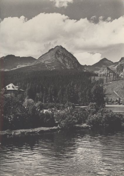 Widok na Szczyrbskie Jezioro. Za nim las, w tle Ostra, Wielkie Solisko i Szczyrbski Szczyt. Z prawej strony skocznia, z lewej willa Marina.