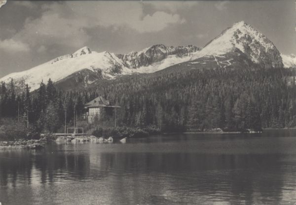 Widok na Szczyrbskie Jezioro W tle od lewej strony ośnieżone szczyty: Krywań, Ostra, Wielkie Solisko. Nad jeziorem wśród drzew widoczna willa Marina.