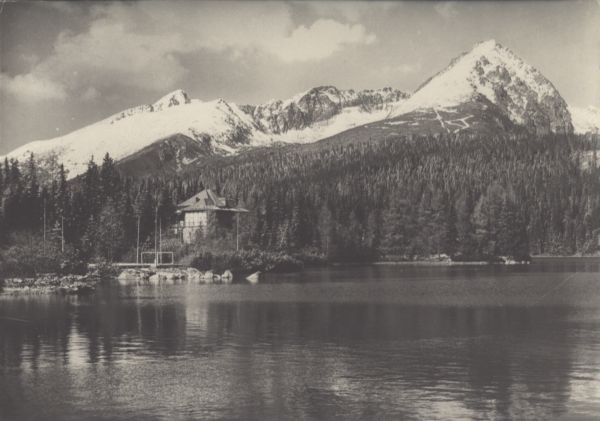 Widok na Szczyrbskie Jezioro W tle od lewej strony ośnieżone szczyty: Krywań, Ostra, Wielkie Solisko. Nad jeziorem wśród drzew widoczna willa Marina.