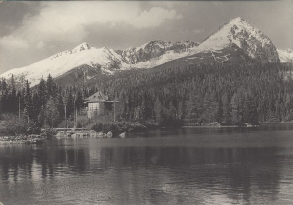 Widok na Szczyrbskie Jezioro W tle od lewej strony o¶nieżone szczyty: Krywań, Ostra, Wielkie Solisko. Nad jeziorem w¶ród drzew widoczna willa Marina.