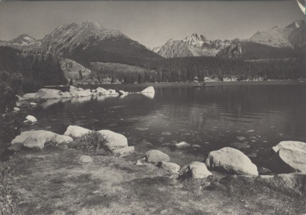 Widok znad Szczyrbskiego Jeziora. Na pierwszym planie brzeg stawu z granitowymi głazami. Na jeziorze łódka z dwoma osobami. W tle las i szczyty, od lewej: Szczyrbski Szczyt, Grań Baszt ze Skrajn± Baszt±, Kopa Popradzka, Wysoka i Kończysta.