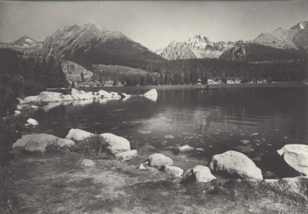 Widok znad Szczyrbskiego Jeziora. Na pierwszym planie brzeg stawu z granitowymi głazami. Na jeziorze łódka z dwoma osobami. W tle las i szczyty, od lewej: Szczyrbski Szczyt, Grań Baszt ze Skrajn± Baszt±, Kopa Popradzka, Wysoka i Kończysta.
