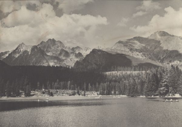 Widok otoczenia Szczyrbskiego Jeziora, z pływającymi po nim łódkami. W tle Kopa Popradzka, Wysoka, Osterwa, Tępa i Kończysta.