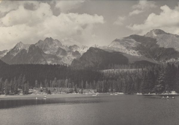 Widok otoczenia Szczyrbskiego Jeziora, z pływającymi po nim łódkami. W tle Kopa Popradzka, Wysoka, Osterwa, Tępa, Kończysta.