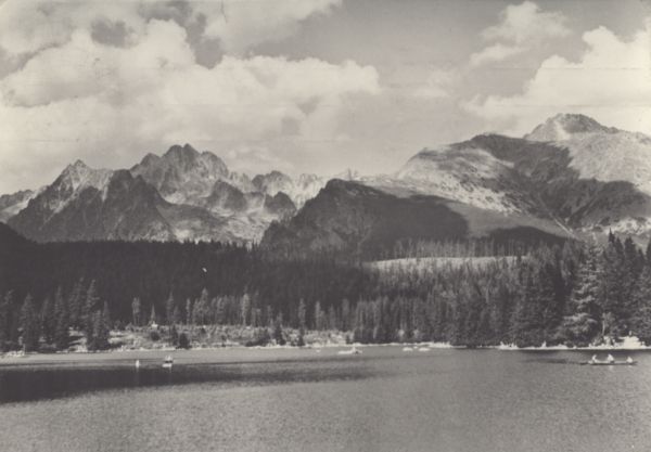 Widok otoczenia Szczyrbskiego Jeziora, z pływającymi po nim łódkami. W tle Kopa Popradzka, Wysoka, Osterwa, Tępa, Kończysta.