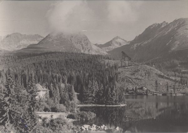 Widok Szczyrbskiego Jeziora z odbijaj±cymi się wodzie szczytami. Nad stawem po prawej stronie willa Maryna. Dalej las i skocznia narciarska pod Skrajnym Soliskiem. W tle szczyty: Ostra , Skrajne Solisko, Szczyrbski Szczyt i Baszty ze Skrajn± Baszt±.